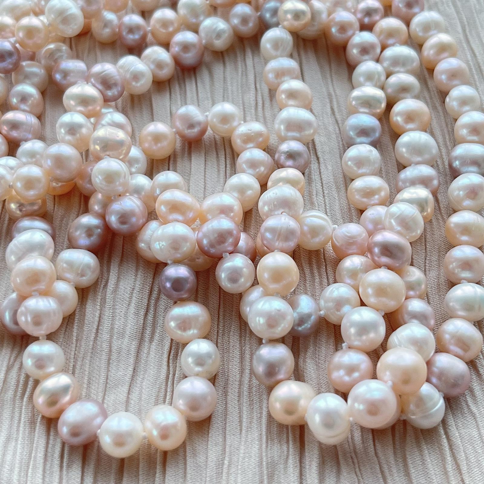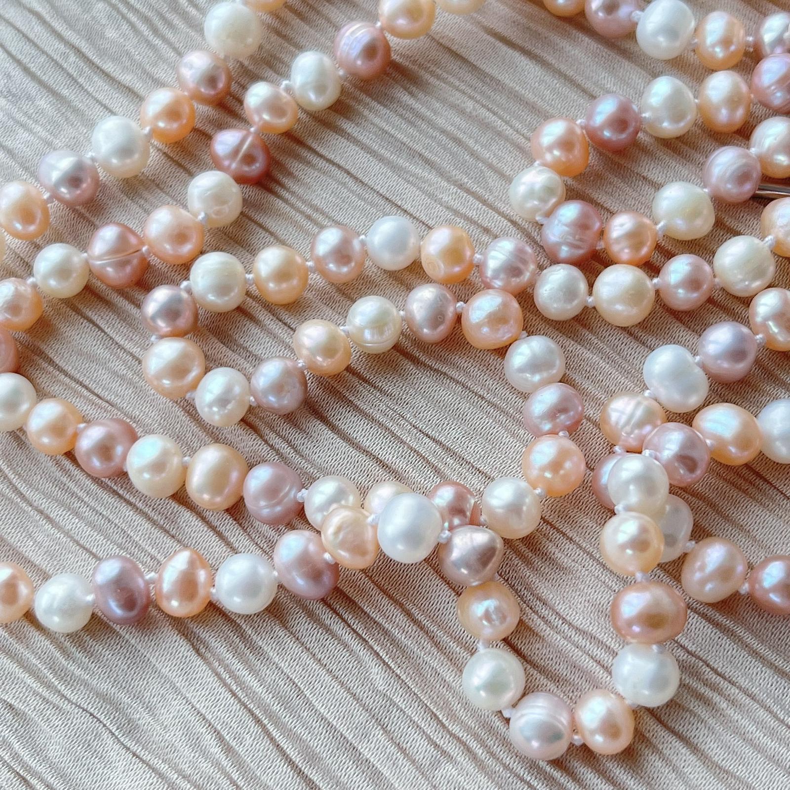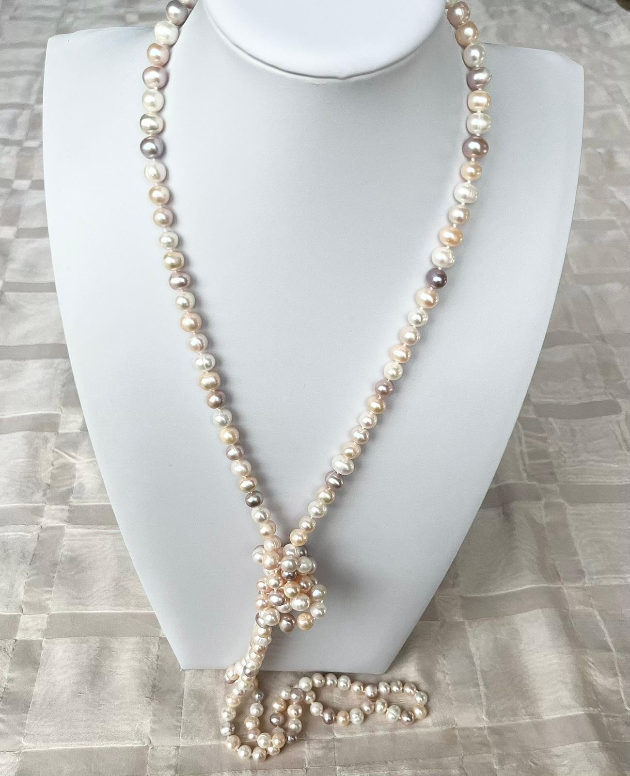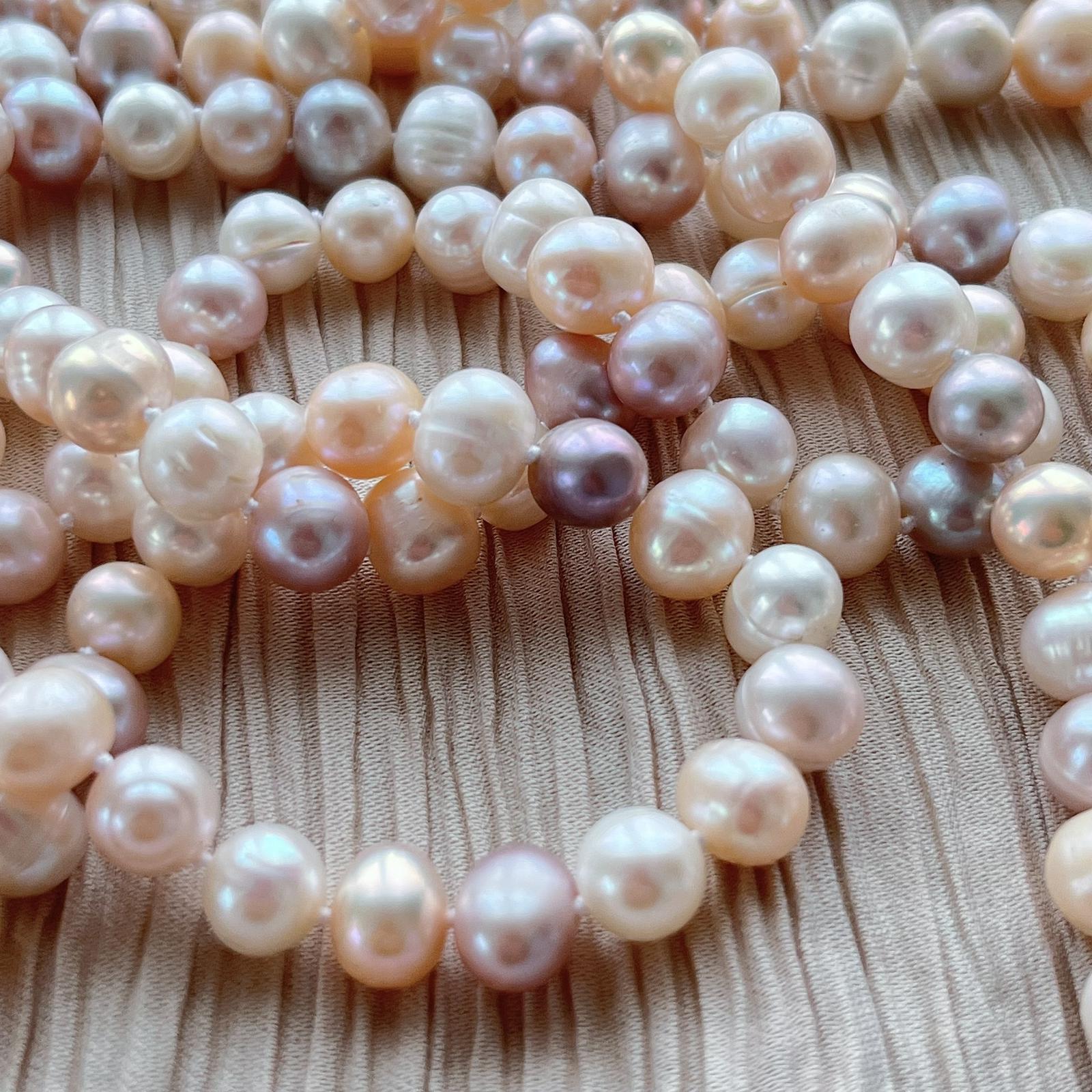 Ce collier sautoir de belles perles de culture blanches roses et saumon est sublime. 152 cm de perles naturelles.