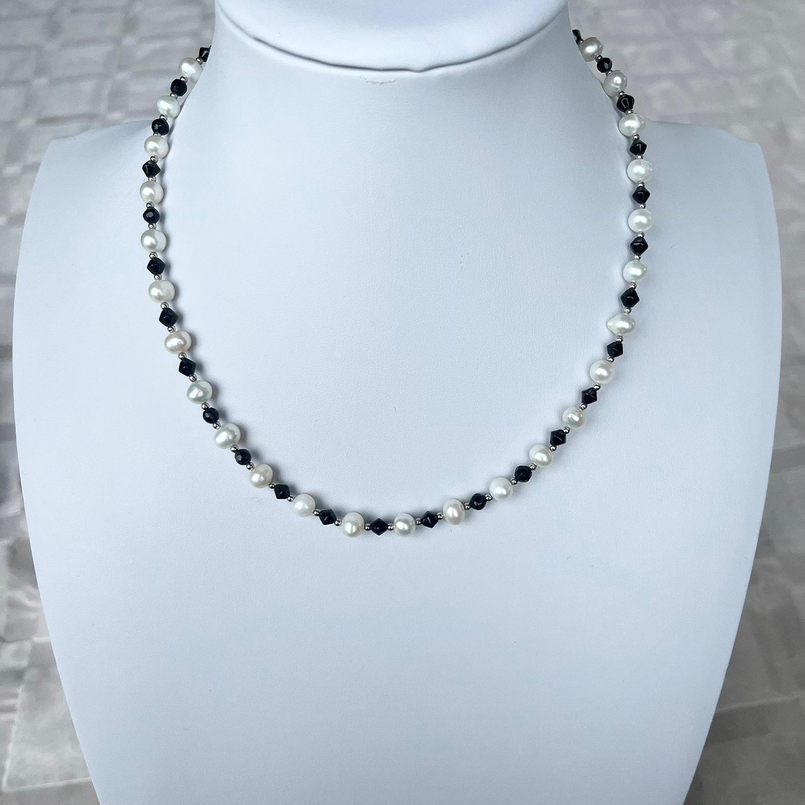 Ce collier composé d'une rangée de perles de culture noires, blanches et perles fantaisies est féminin et moderne.
