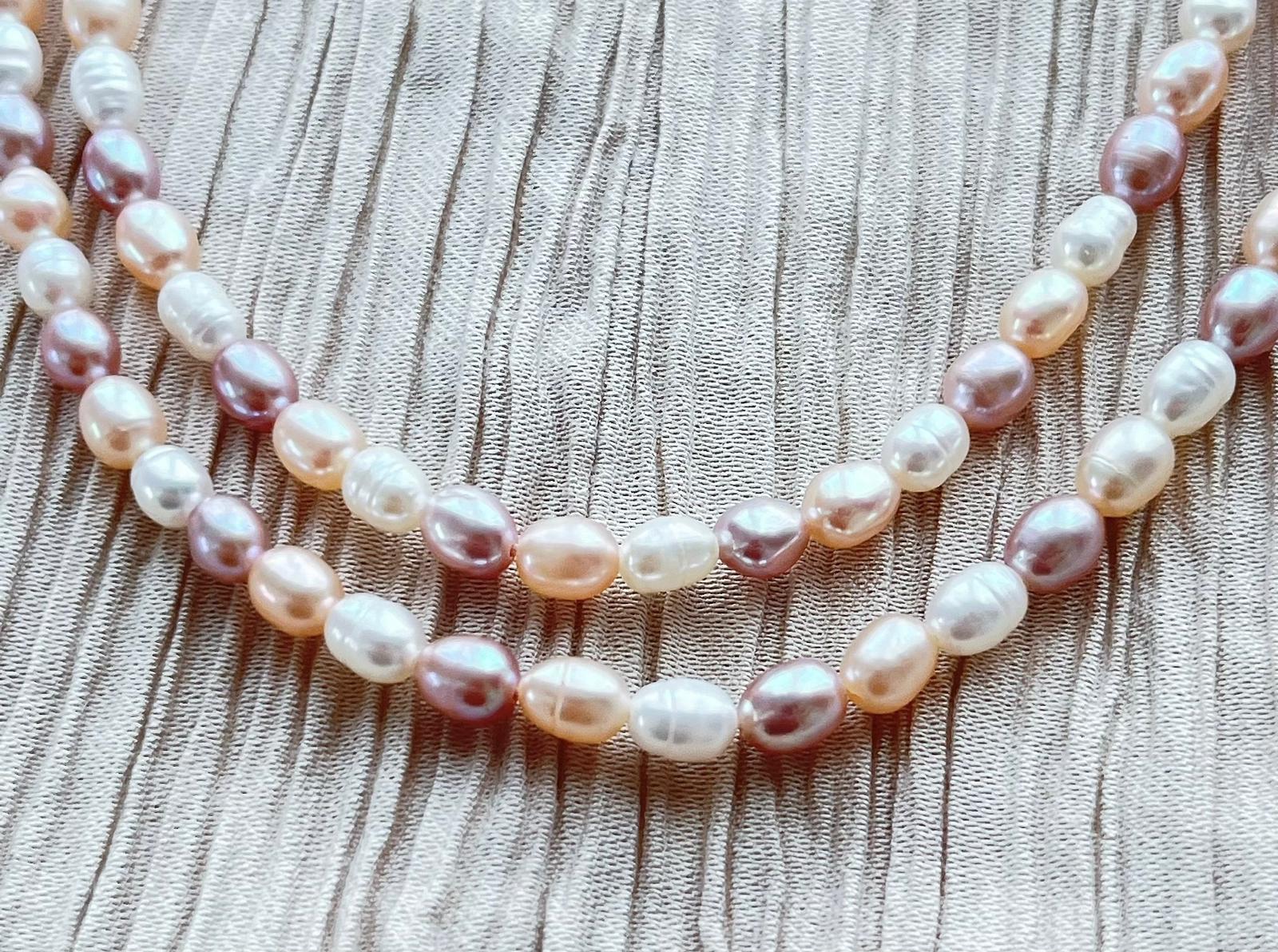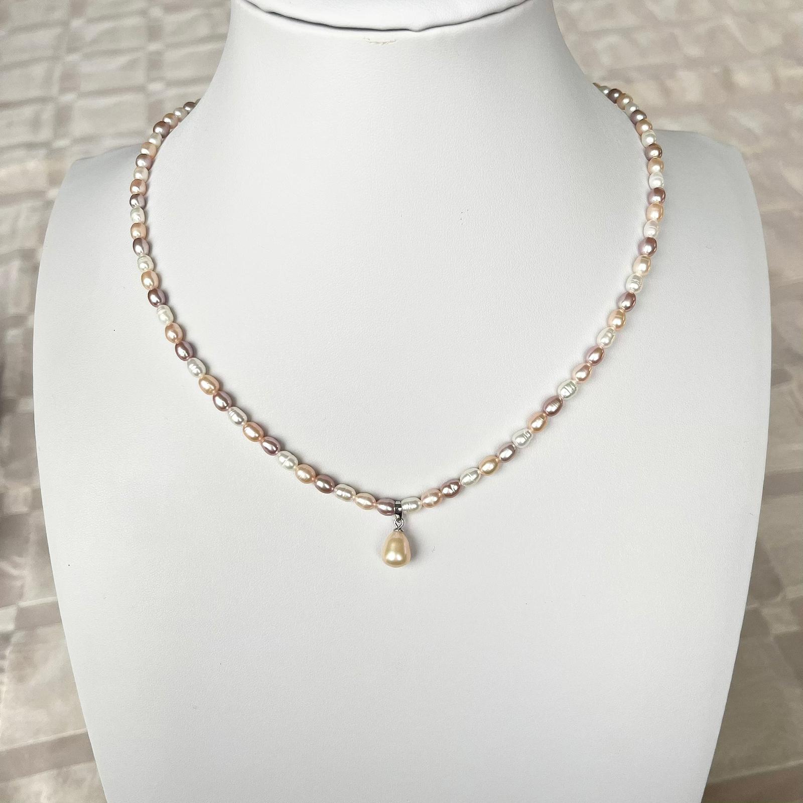 Ce collier composé de perles de culture tricolore forme grain de riz avec un pendentif est d'une grande élégance.