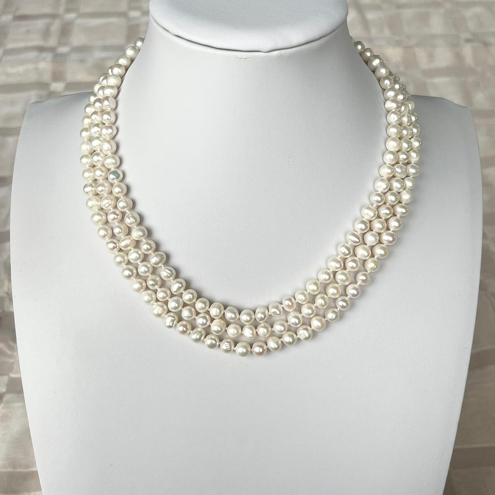 Ce collier composé de trois rangées de perles de culture blanches est une valeur sûre.