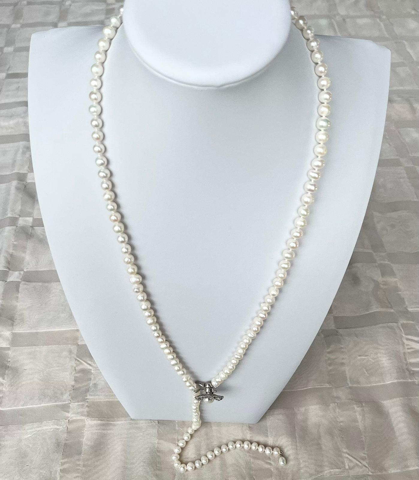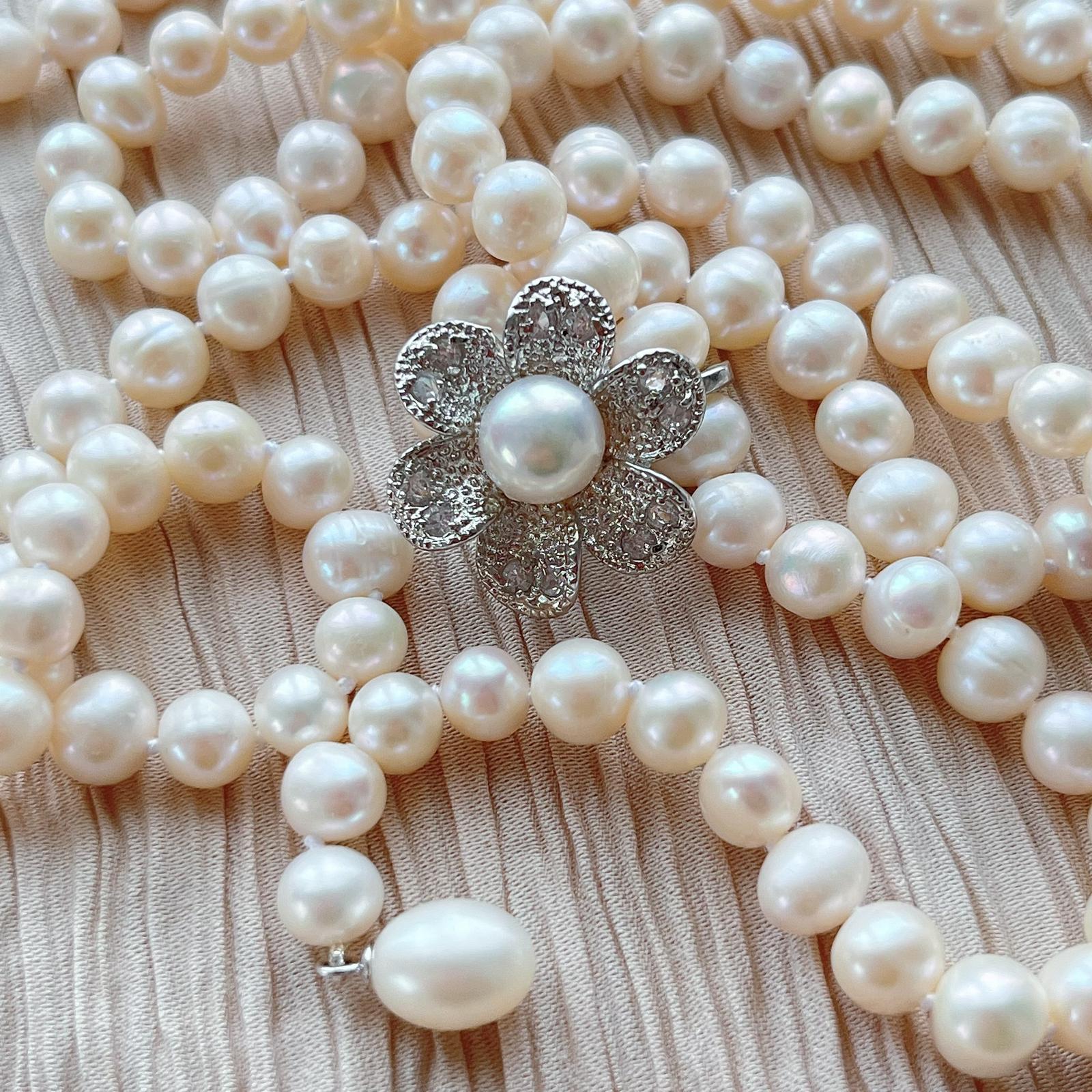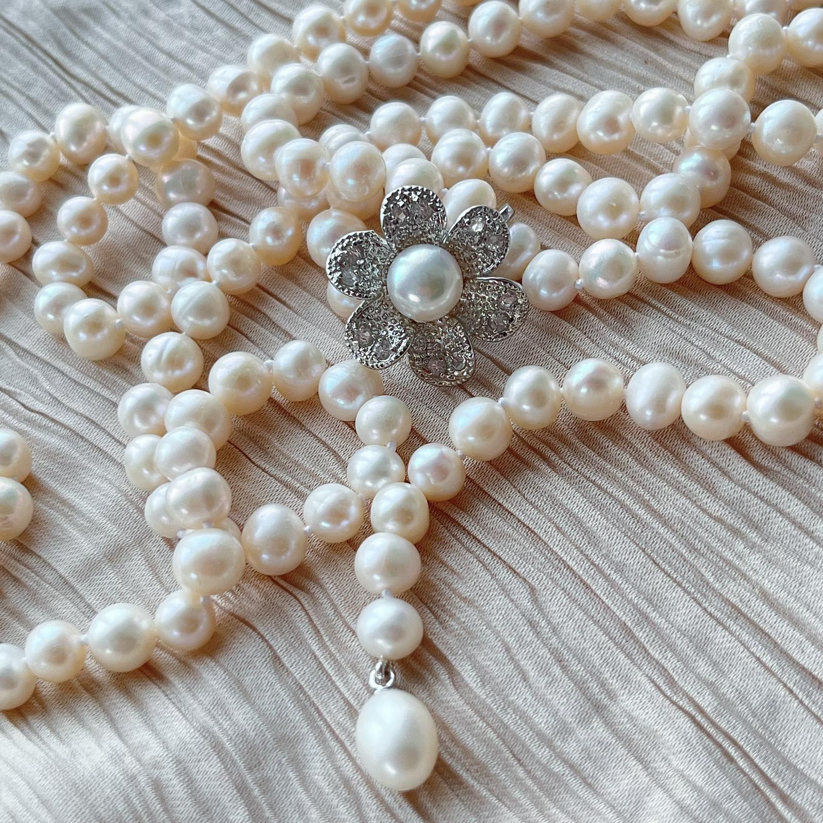 Ce collier sautoir de belles perles de culture blanches et sa boucle en fleur zirconium est très féminin et original.