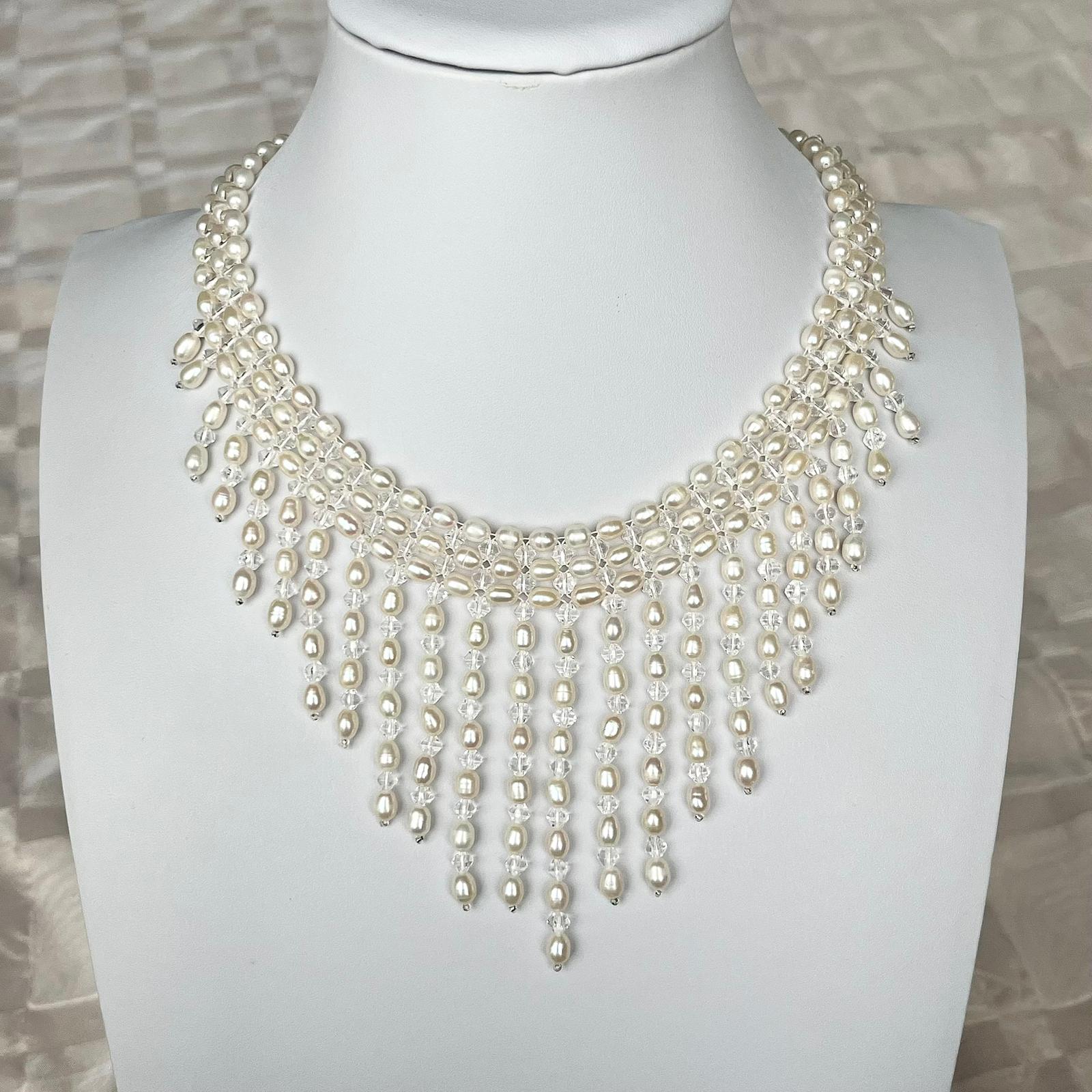Ce collier composé de trois rangées de petites perles de culture baroques blanches et ses franges est juste magnifique !
